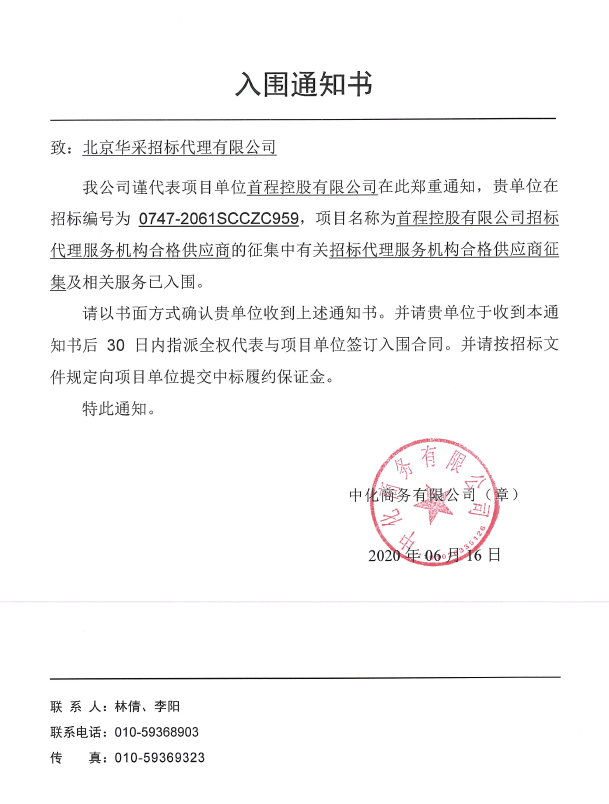 北京华采招标代理有限公司成功入围首程控股有限公司招标代理机构